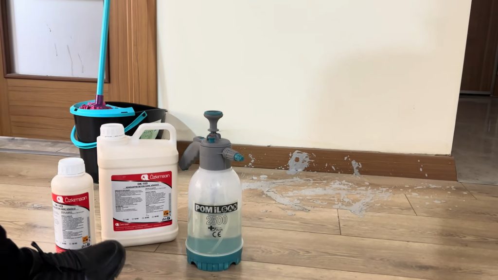 Parkeye bulaşan çimento; Özkimsan Endüstri Kimyasalları tarafından üretilmekte olan OK-103 beton sökücü ürün ile sökülür.